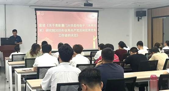 7月1日下午,厦门大学柔性电子(未来技术)研究院在新工科大楼812会议室召开庆祝中国共产党成立104周年暨“七一”表彰会议,对过去一年在党建工作中表现突出的优秀共产党员和优秀党务工作者进行表彰。研究院党员领导干部及全体师生党员参加会议,共同回顾党的光辉历程,表彰先进典型,凝聚奋进力量。