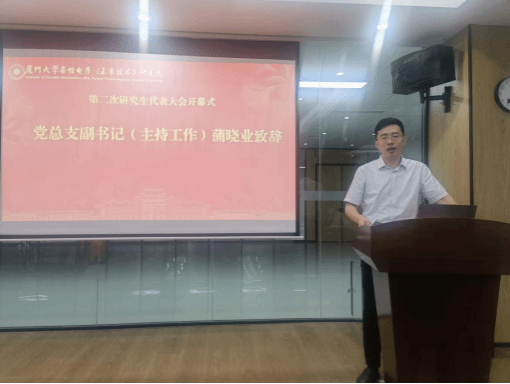 蒲晓业发表致辞。他首先对大会的胜利召开表示热烈祝贺,向承载全院同学期望的研究生代表、即将接过工作接力棒的新一届研会成员致以亲切问候,并向长期支持研会工作的师生致以诚挚感谢。