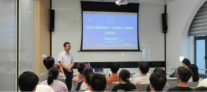 常务副院长霍峰蔚教授代表研究院向2024级新生的到来表示欢迎,随即为新同学们上了开学第一课,带来了内容丰富的专业学习教育。他详细介绍了研究院的发展历程、组织架构、发展目标与条件保障,深入讲解了研究院的人才培养、学科科研、对外合作以及成果转化等方面内容。特别是结合自身的科研实践,详细阐述了当前新技术革命蓬勃发展的时代背景下,柔性电子广阔的发展前景与应用空间,鼓励同学们把握学术前沿,潜心科研创新,为柔性电子未来技术发展贡献青春力量。通过霍院长的讲解,新生们对本专业的研究方向和内容有了更深刻的认识,为他们在柔性电子学科领域的探索指明了方向。