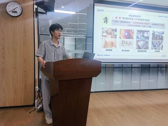 作为研究院特色,“柔性电子学科介绍”环节成为一大亮点。选手们结合学科发展历程,系统梳理了柔性电子学科从海外到国内、从基础研究到应用创新的跨越发展。通过“平面是相对的,曲面是绝对的”这一核心理念,生动解读了柔性电子“轻薄柔透”的四大特性,及其在可穿戴设备、生物医疗、能源系统等领域的前沿应用,展现了“科技报国”的学科担当。