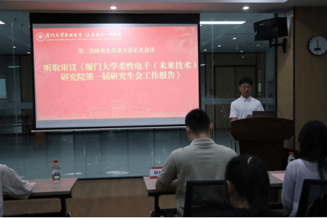 随后,第一届研究生会办公室负责人刘振奇代表第一届研会作工作报告。报告以“服务同学、凝聚力量、助力发展”为核心,系统回顾过去一年工作成果:思想引领上,通过“学习党的二十大”专题培训、红色影片观看、陈嘉庚纪念馆参观等筑牢信仰根基;组织建设上,构建“主席团+6部门”架构,完善例会、管理、考核制度;学术服务上,“柔性电子前沿论坛”覆盖200余人次、“柔创青年说”开展4期分享,助力营造“勤学、善思、笃行”学风;文体活动上,组织校运动会、院篮球和羽毛球赛事、新春团拜会等丰富课余生活;就业支持上,举办专场招聘会,开展简历制作、面试技巧培训与职业规划大赛。报告同时提出“细化工作制度、创新服务形式”的建议,为新一届研会工作提供参考。