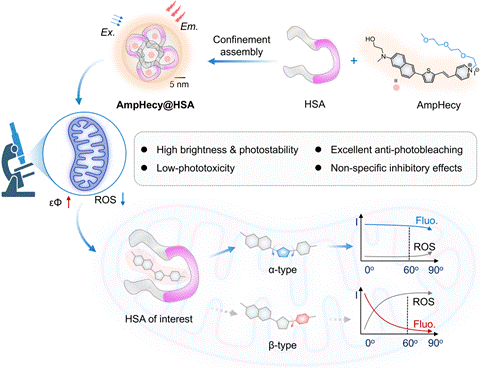 针对上述问题,研究团队提出了“蛋白质限域调控染料激发态释能途径”的新策略,开发了基于人血清白蛋白(HSA)的荧光激活蛋白(FAP)纳米显影剂AmpHecy@HSA,通过HSA与双亲性吡啶菁染料(AmpHecy)的非共价自组装,实现了高亮度、低光毒性及优异细胞渗透性的线粒体超分辨荧光成像。该研究结合蛋白显影剂共晶晶体解析、分子动力学模拟、超快瞬态吸收光谱及量子化学计算,探究了AmpHecy@HSA纳米显影剂的组装模式,阐明了荧光增强的结构基础,揭示了蛋白限域作用通过调控染料分子构象进而优化其激发态释能途径(抑制非辐射弛豫、减少活性氧生成)的分子机制。这类蛋白显影剂在活细胞线粒体结构照明显微(SIM)成像中展现出优异性能,为长时程、高保真线粒体超分辨荧光成像提供了理想的分子工具。该研究充分阐明了化学、物理和生物学学科界面的跨学科问题,彰显了交叉学科协作在前沿科学领域探索中的巨大潜力。