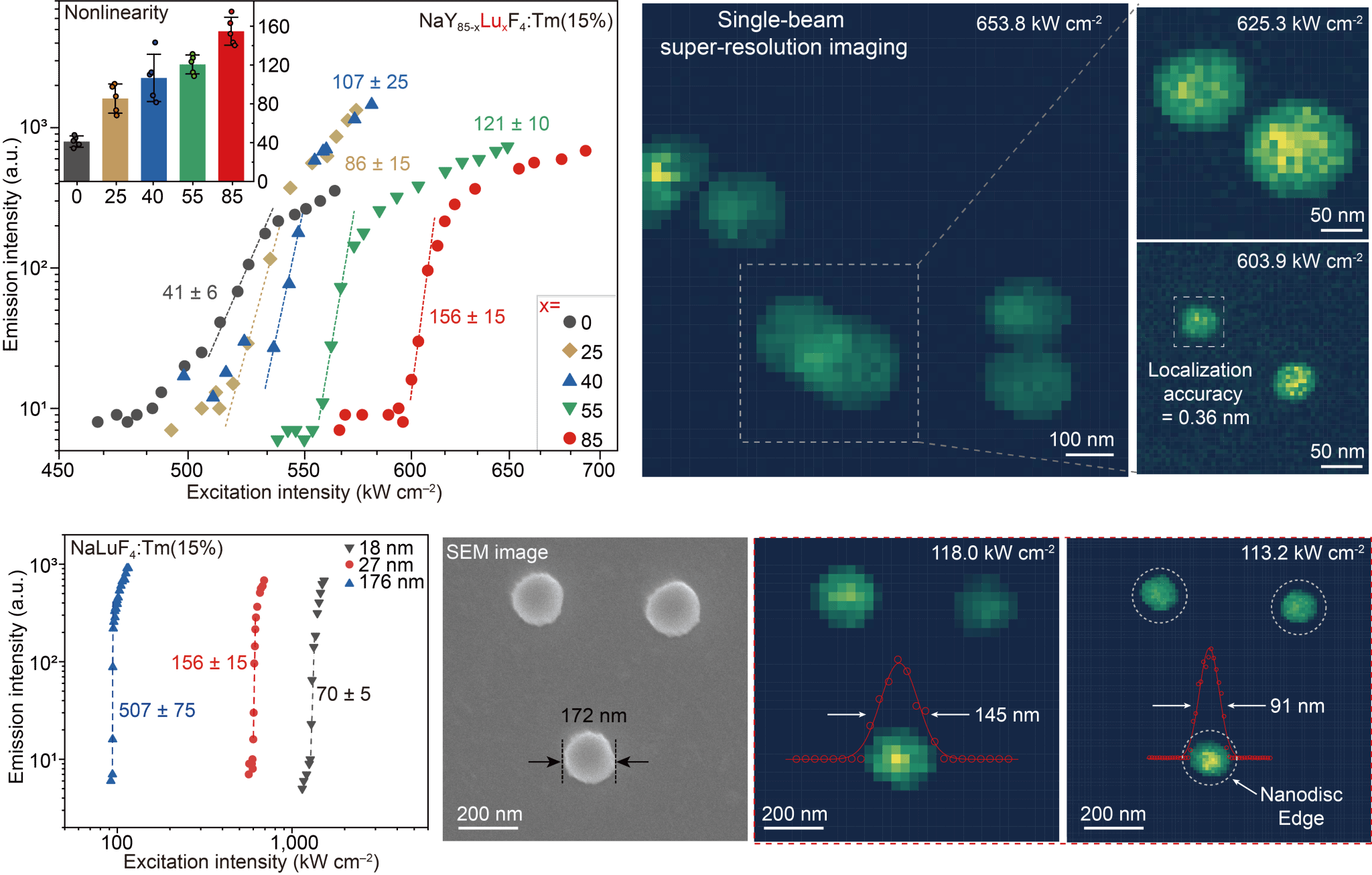 图2:光子雪崩纳米晶所表现出的极高光学非线性及其在单束光激发下实现的超分辨成像效果。