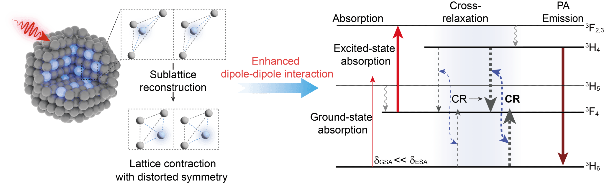 光子雪崩是镧系掺杂材料中一种独特的光学非线性现象,能量正反馈循环过程使其发光强度与泵浦功率表现出极其陡峭的幂律关系,使得极微弱的泵浦扰动或环境变化,也能诱发发光强度的显著突变。凭借这一特性,光子雪崩在低成本超分辨成像、超灵敏光学传感和多物理场探测等应用中展现出巨大潜力。当前亟需开发具备超高阶光学非线性响应的光子雪崩材料,以满足前沿光学应用对极限性能的迫切需求。由于镧系离子4f–4f跃迁的宇称禁戒特性,其辐射与非辐射过程高度依赖于所处晶体环境的对称性。因此,晶体场调控能够有效调节电偶极相互作用的耦合强度,从而影响离子间能量传递的效率,在构建高效雪崩体系中具有重要潜力。