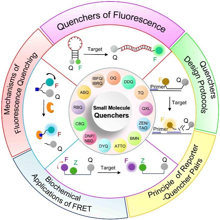 Förster共振能量转移(FRET)是生化活性检测最为广泛使用的机制之一。猝灭剂(quenchers)指通过分子间的能量转移,迅速而有效地将激发态分子猝灭,以非辐射方式返回基态的一类分子。小分子猝灭剂已被广泛用作FRET探针受体,降低本底荧光信号干扰,提高检测灵敏度,从而用于监测生理过程,如体内多色分析、蛋白质折叠动力学研究、预测分子间的距离、生物酶分析和生物标志物实时成像等。